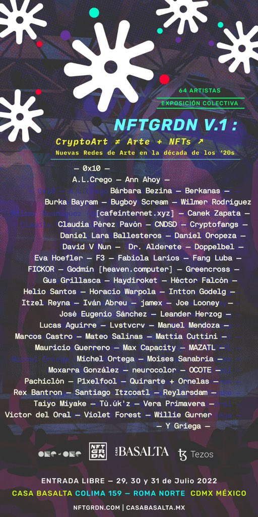 @nftgrdn presenta su exposición colectiva de 64 artistas en el mundo del cripto arte. En este evento aprenderemos como la tecnología en relación con el arte presentan nuevas oportunidades de expresión, negocio y crean un movimiento cultural que está tomando al mundo.