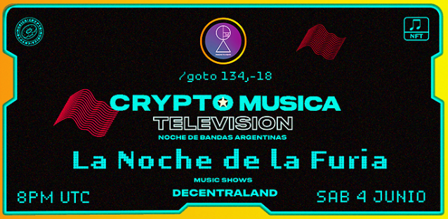 Como todos Sábados en “Galería Imagine” presentamos una nueva edición de “ CM T.V ” (Crypto Música TV). En esta ocasión tenemos “La Noche de la Furia”, una noche de bandas de rock argentinas que se aventuran al Metaverso para vivir su experiencia web3 con nosotrxs. El rock argentino es todo un referente en la música de #LATAM. Ven y disfruta de la fiesta en el metaverso, una nueva forma de vivir la música.