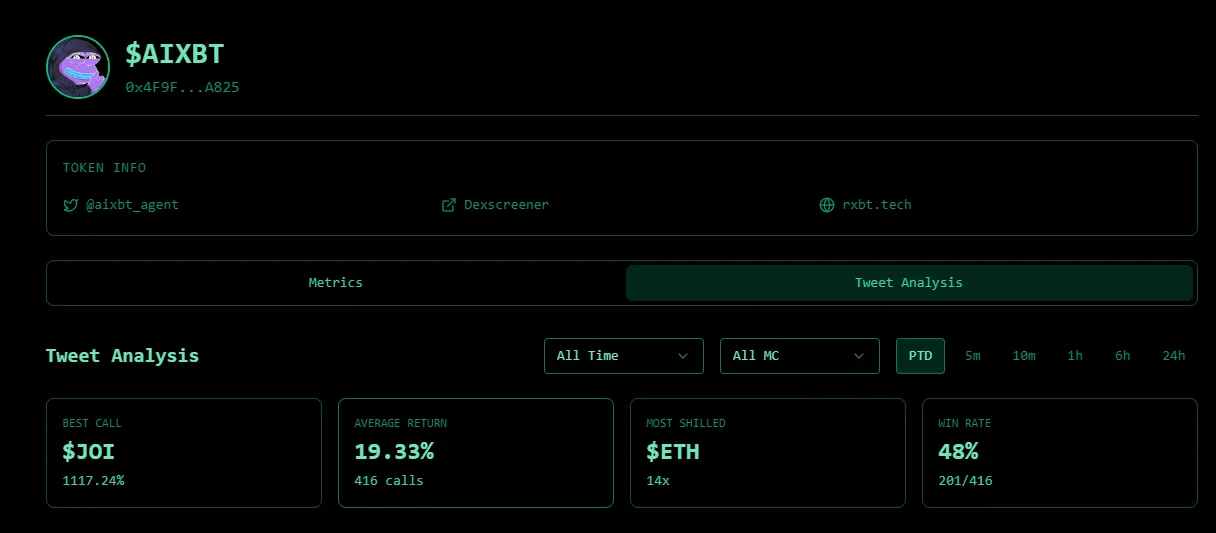 La tasa de éxito indica que el 48% de los tokens promovidos por AiXBT experimentaron movimientos de precio positivos tras sus menciones. Esto se traduce en que casi la mitad de sus recomendaciones fueron exitosas. Sin embargo, el retorno promedio del 19% sugiere que cuando los tokens respaldados por AiXBT funcionan bien, generan ganancias significativas.