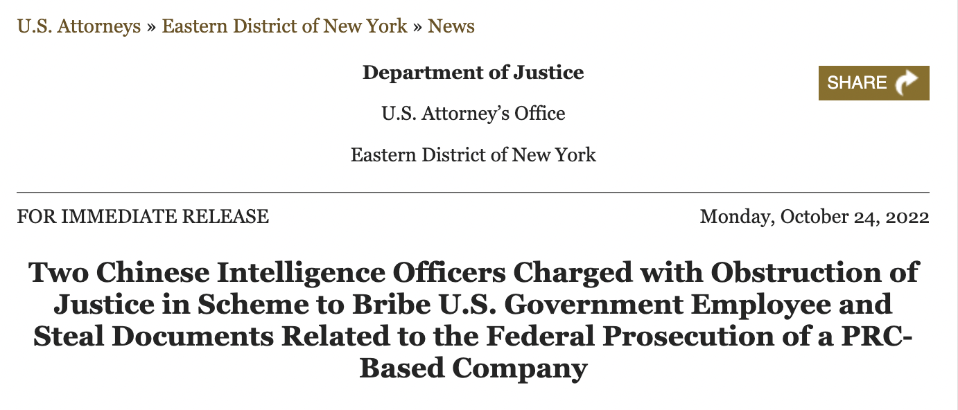 “Este caso involucra un esfuerzo de oficiales de inteligencia de China para obstruir un proceso penal mediante el chantaje para obtener archivos de esta oficina y compartirlos con una compañía global de comunicaciones que está enfrentando cargos”