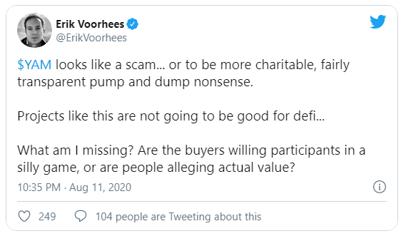 Mientras que el CEO de Shapeshift, Erik Voorhees [@ErikVoorhees] no se guardó nada, etiquetándolo como una “estafa” y “pump and dump sin sentido”.