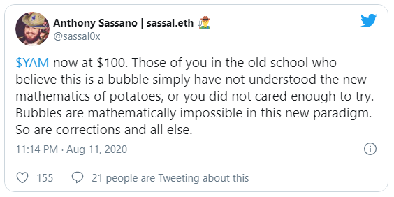 Anthony Sassano [@sassal0x], cofundador de Ethhub, afirmó que “las burbujas son matemáticamente imposibles” en este nuevo paradigma: