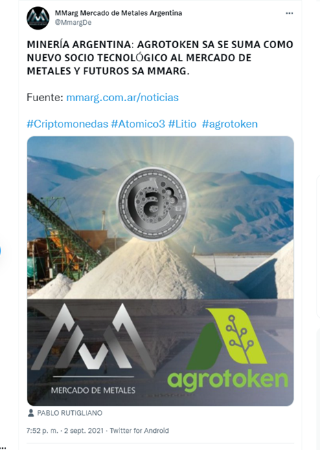 El presidente y fundador de Mercado de Metales y Futuros, Pablo Rutigliano, y el presidente de la compañía Agrotoken, Eduardo Novillo, anunciaron la celebración de un acuerdo comercial, en el que Agrotoken tendrá una participación significativa en las actividades del Mercado de Metales y Futuros, a través de procesos de tokenización y digitalización de metales no ferrosos y preciosos.