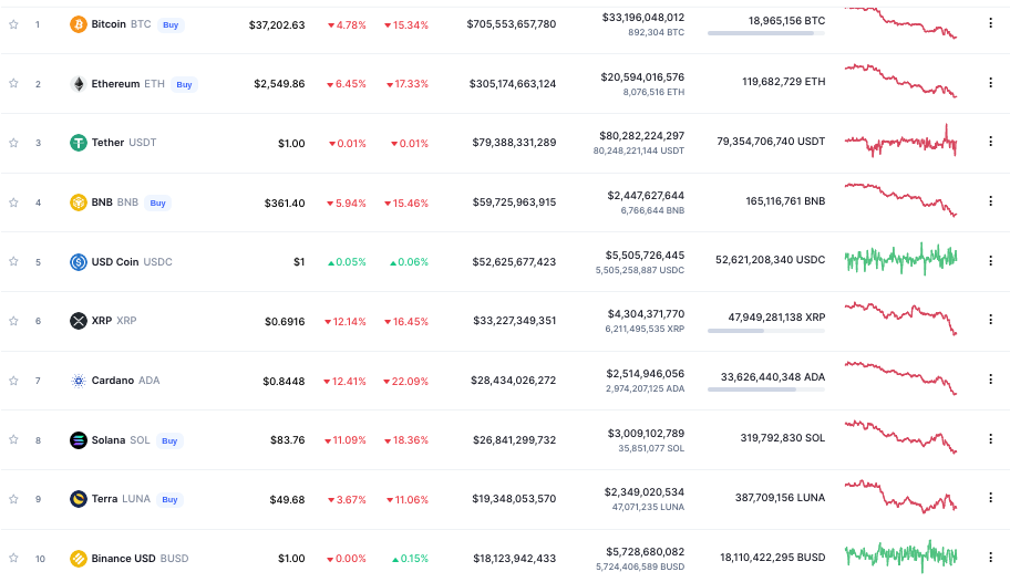 Esta situación también se puede evidenciar en el precio de las criptomonedas. Bitcoin (BTC) cotiza actualmente en 37,200 dólares, lo que representa una caída del 4.78% en las últimas 24 horas.