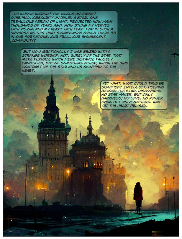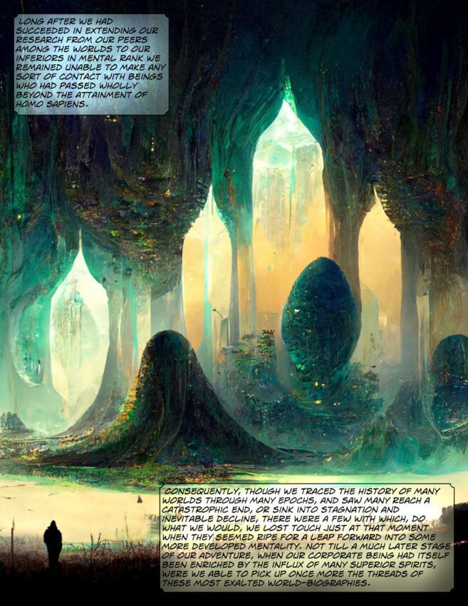 Hess dice que Midjourney es excelente en algunas cosas y absolutamente terrible en otras. “Es muy difícil generar escenas de acción, o figuras humanas en absoluto. No puedes crear el mismo personaje una y otra vez, y así sucesivamente. Sin embargo, Star Maker es un libro inusual en varios sentidos.
