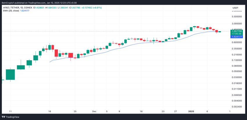 Una evaluación del gráfico diario de AI16Z/USD muestra que la altcoin rompió por debajo de su media móvil exponencial (EMA) de 20 días durante la sesión de trading intradá del jueves.