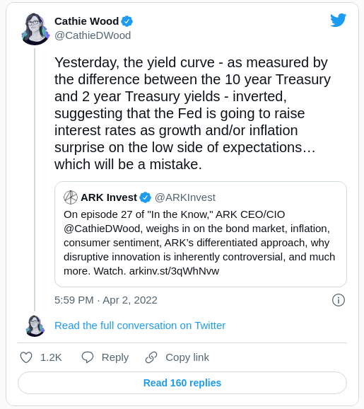 El rendimiento de los bonos a dos años superó al de 30 años por primera vez desde 2007 tras un sólido informe de empleo el 1 de abril. La administradora de cartera pro-cripto ofreció su opinión sobre por qué aumentar las tasas de interés es un “gran error”.