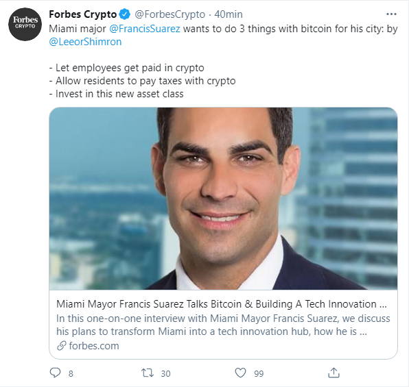 A través de una entrevista publicada por Forbes el lunes 8 de febrero, el alcalde de Miami, Francis Suárez, conversó acerca de su plan para convertir a la ciudad en un centro de innovación tecnológica. Igualmente profundizó acerca de la adopción de Bitcoin y las criptomonedas, el cambio climático y muchos otros temas.