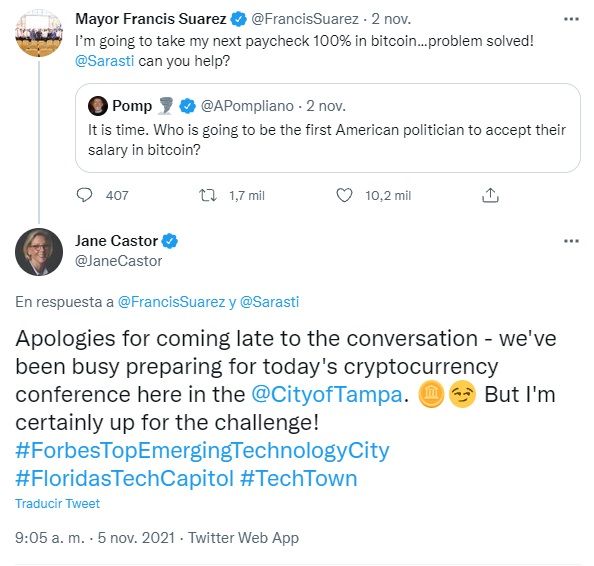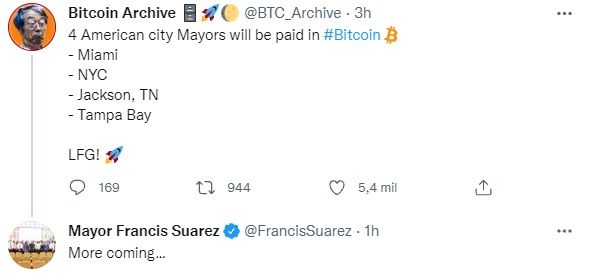 Posteriormente, ante un tweet de la cuenta @BTC_Archive, el cual resaltaba el hito de los cuatro alcaldes que aceptarán sus pagos en Bitcoin, el alcalde Francis Suárez respondió: “Vienen muchos más”.
