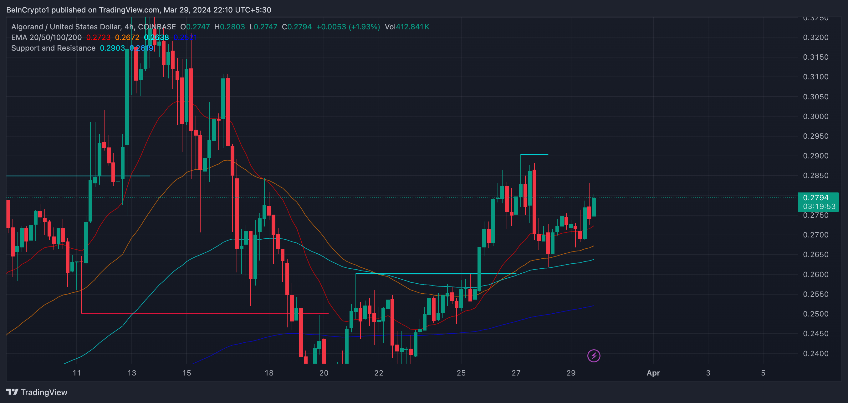 Si la tendencia alcista continúa, ALGO probablemente testará su anterior resistencia en 0.32 dólares. Si hay ruptura, Algorand podría seguir subiendo en abril para testar la siguiente resistencia en 0.41 dólares.