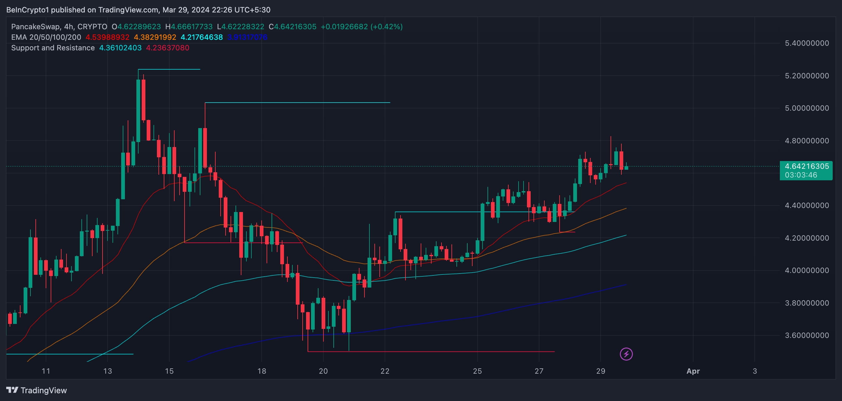 El gráfico de 4 horas de CAKE muestra una tendencia alcista. Las EMA a corto plazo (20 y 50) se encuentran por encima de las de largo plazo (100 y 200). Esto indica un impulso alcista.