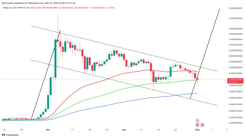 Shiba Inu (SHIB) se tambalea actualmente en un borde precario. Un nivel técnico crucial apoya la criptomoneda meme rondando los 0.000021 dólares: la Media Móvil Exponencial (EMA) de 100 días.