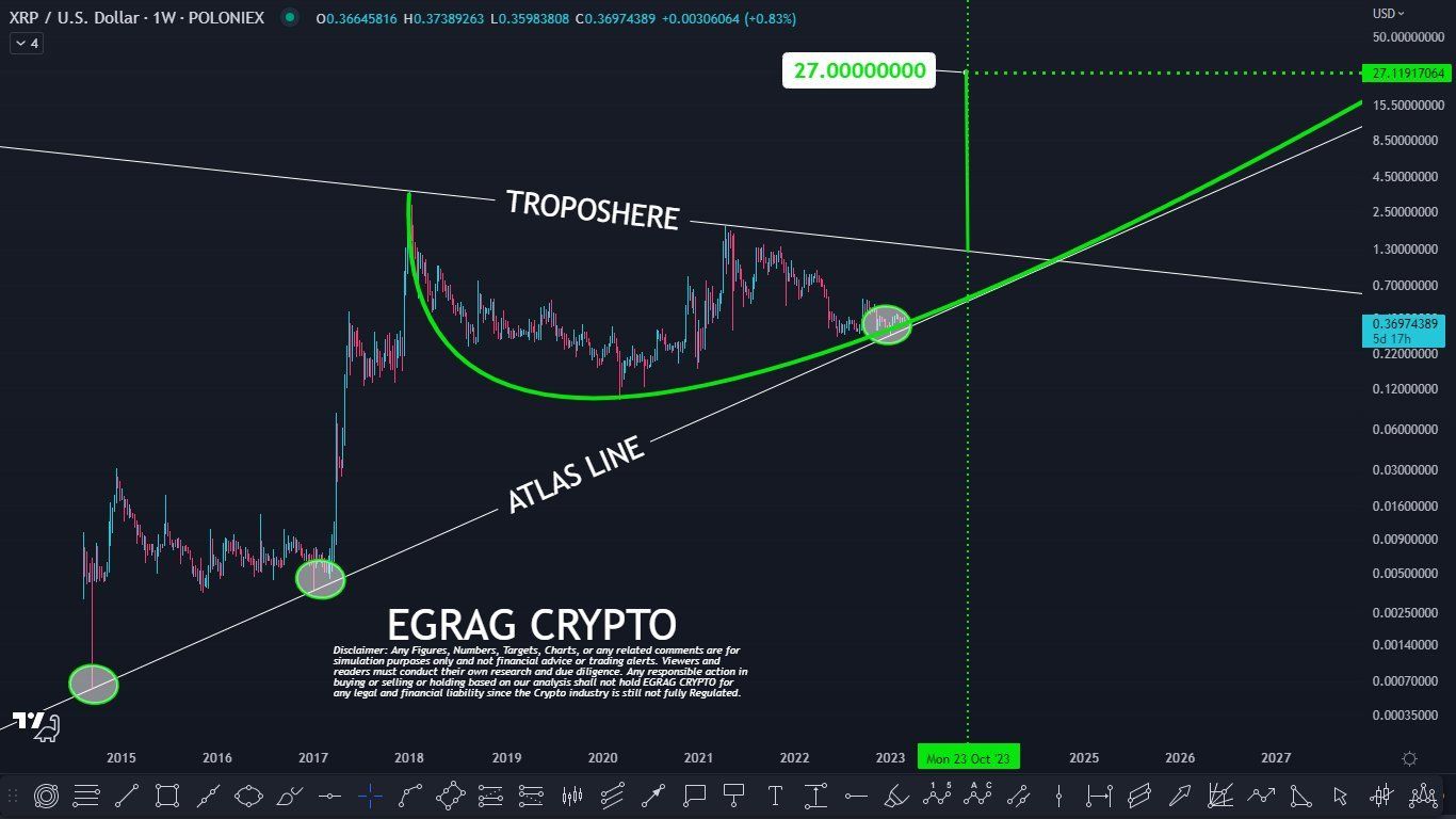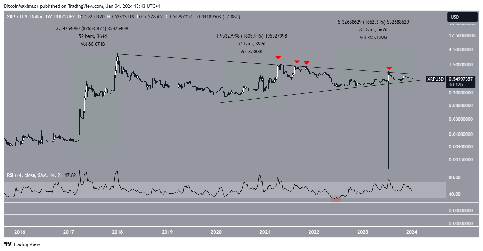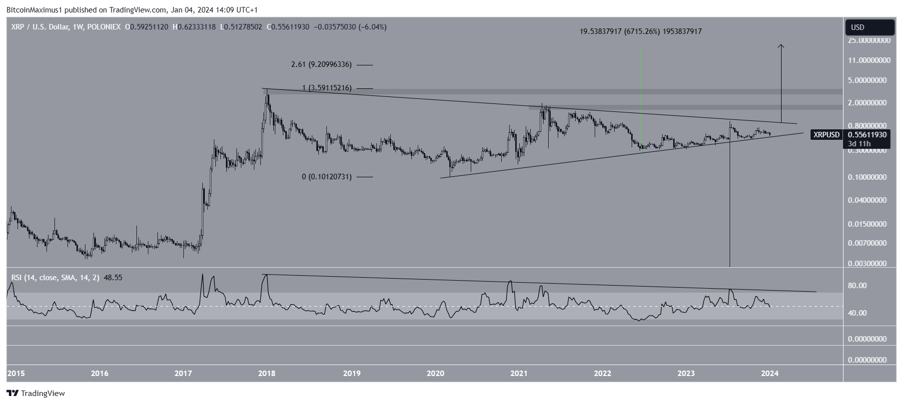 Suponiendo un máximo de un aumento del 1,800% desde el mínimo del ciclo de 2022, XRP podría alcanzar un máximo de 5,60 dólares si la suposición se cumple.