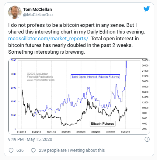En mayo de 2020, BeInCrypto informó que el número total de futuros de Bitcoin de interés abierto casi se duplicó en solo dos semanas de 6,000 a más de 10,000 contratos. Esto se produjo el mismo mes en que el valor total de los futuros de Bitcoin de interés abierto aumentó a un nuevo máximo histórico de 500 millones dólares.