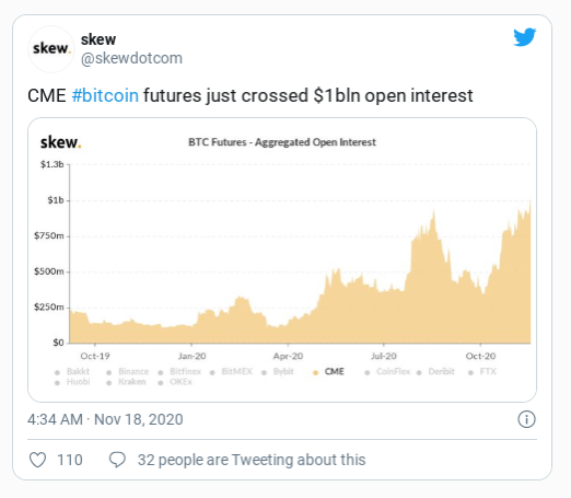 Esto fue revelado el 18 de noviembre en un tweet de la firma de análisis de trading de criptomonedas Skew. Las cifras de interés abierto agregadas para los futuros de BTC alcanzaron los 1.02 mil millones de dólares en el CME.
