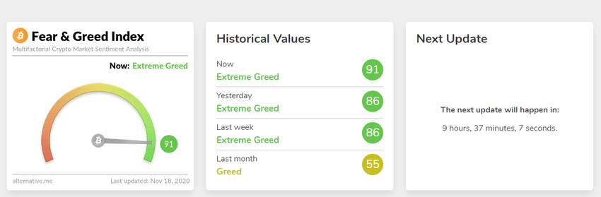 Bitcoin continúa su aumento histórico a niveles de precios no vistos desde fines de 2017, con el precio superando los 18,000 dólares el 18 de noviembre. El Crypto Fear & Greed Index ahora tiene una lectura de alrededor de 90, lo que significa “Extreme Greed”.