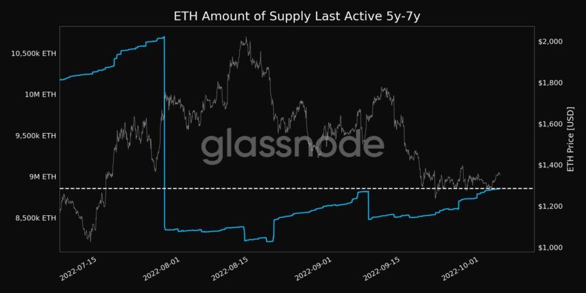 La cantidad de suministro de Ethereum durante los últimos 5 a 7 años activos alcanzó un máximo de 1 mes de 8,855,342.913 ETH, lo que significa que algunos holders a largo plazo podrían estar buscando hacer un movimiento en el mercado que, a su vez, puede afectar los precios.