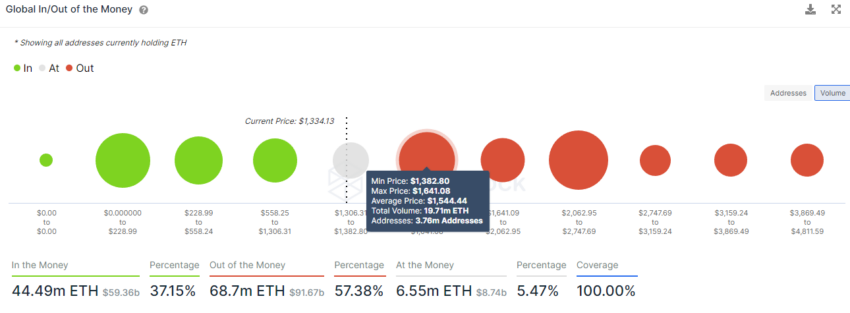 Según el indicador Global In and Out of Money, la siguiente resistencia significativa para ETH fue en la marca de 1,544 dólares, donde 3,76 millones de direcciones tenían más de 19,71 millones de ETH.