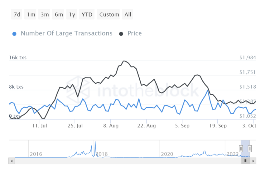 Dicho esto, recientemente, Fidelity anunció que su nuevo Ethereum Index Fund ofrecerá a los clientes acceso a ETH. Junto con el anuncio, se observó un ligero repunte en las grandes transacciones de ETH, lo que generó un interés creciente por parte de las instituciones en los últimos días.