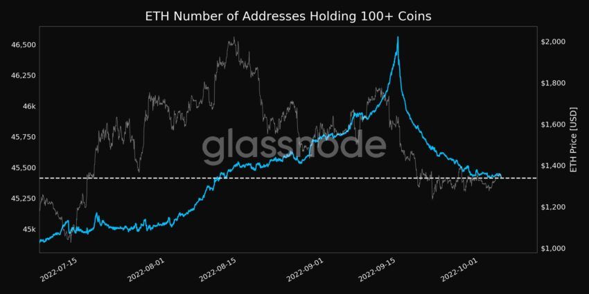 La cantidad de direcciones con más de 100 ETH alcanzó un mínimo de 1 mes de 45,414 el 5 de octubre, según datos de Glassnode Alerts. Una caída sostenida en las direcciones con más de 100 monedas presentó una disminución de la confianza de las ballenas durante el último mes.
