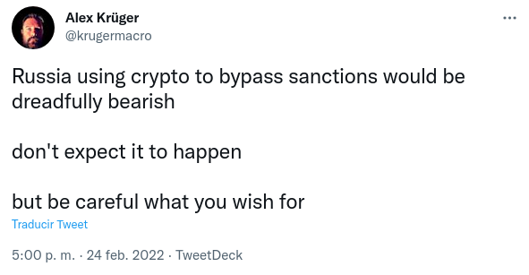 El famoso trader y fundador de Aike Capital, Alex Krüger, señaló que, si Rusia utiliza las criptomonedas para eludir las sanciones sería “terriblemente bajista” ya que ocasionaría una política regulatoria sin precedentes.