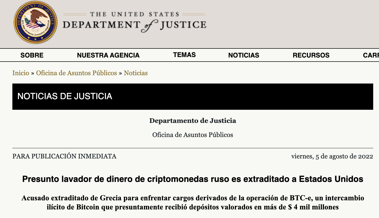 El ciudadano ruso Alexander Vinnik cooperó en el exchange BTC-e, responsable del lavado de más de 4 mil millones de dólares en fondos| criminales. La Oficina de Asuntos Internacionales del Departamento de Justicia de Estados Unidos y el Gobierno de Grecia hicieron posible la extradición desde Grecia.
