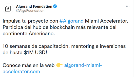 La fundación Algorand ha anunciado la creación del “hub de blockchain más relevante del mundo americano” con su programa acelerador para empresas dedicadas a la tecnología blockchain o al uso e intercambio de criptomonedas, debido al gran auge de este este “nicho” en Miami y Latinoamérica.