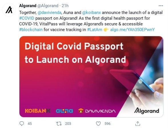 El lanzamiento de VitalPass fue anunciado por Algorand a través de su cuenta en Twitter: