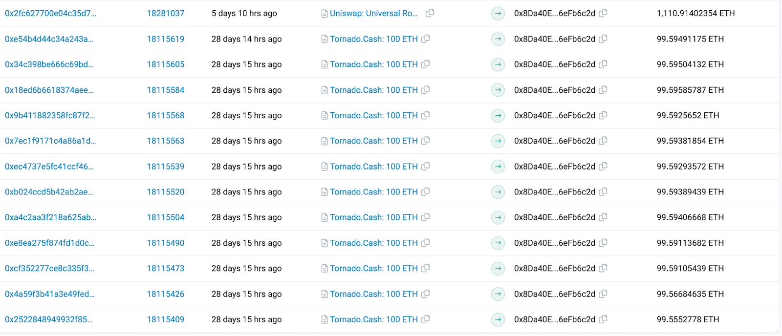 Al rastrear el flujo de fondos en la cadena, se puede ver que 0xe1ao recibió 1,115,90 ETH de otro monedero: 0x8Da4. Sin embargo, 0x8Da4 recibió los fondos del mezclador de criptomonedas Tornado Cash en lotes de alrededor de 99,5 ETH.