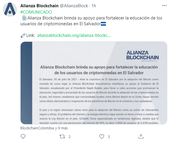“Ante la coyuntura en El Salvador por la adopción del Bitcoin como moneda de curso legal, la Alianza Blockchain Iberoamérica manifiesta su apoyo al Gobierno de El Salvador, encabezado por el Presidente Nayib Bukele, para llevar a cabo acciones que promuevan la educación, seguridad y privacidad de los usuarios de Bitcoin durante la adopción de las criptomonedas en el país”.