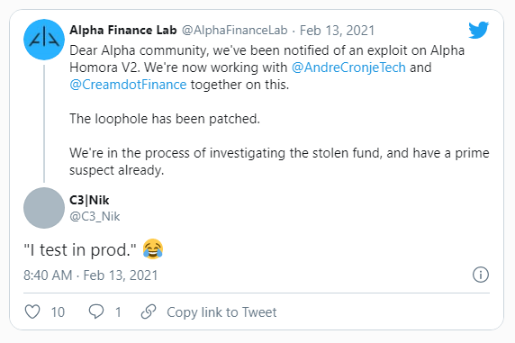 SponsoredEl exploit involucró otro proyecto DeFi, Alpha Finance Lab. Alpha publicó un post mortem explicando exactamente cómo el hacker pudo usar el exploit.