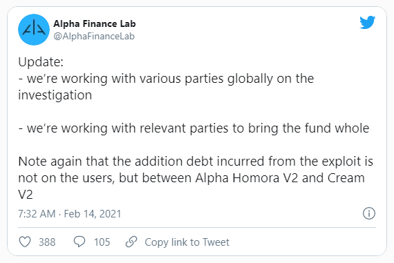 También declararon que se está llevando a cabo una investigación que involucra al equipo de CREAM Finance y al desarrollador de Yearn Finance, Andre Cronje. El esfuerzo conjunto tiene como objetivo encontrar una solución para el exploit, así como identificar al atacante.