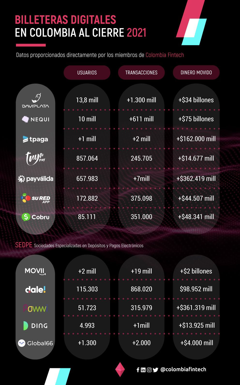 “Cuenta con 857,064 usuarios donde contaron con 245,705 transacciones y movieron 14,677 millones de pesos en operaciones. Es un monedero 100% digital y permite a los colombianos manejar su dinero desde el celular”.