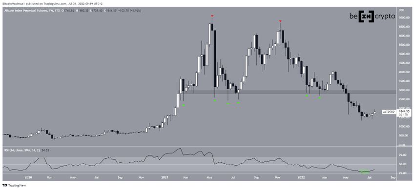 La ALTCAP ha estado cayendo desde que creó un patrón de doble techo (iconos rojos) en noviembre de 2021. El doble techo se considera un patrón bajista, lo que significa que generalmente conduce a reversiones de tendencia bajista.
