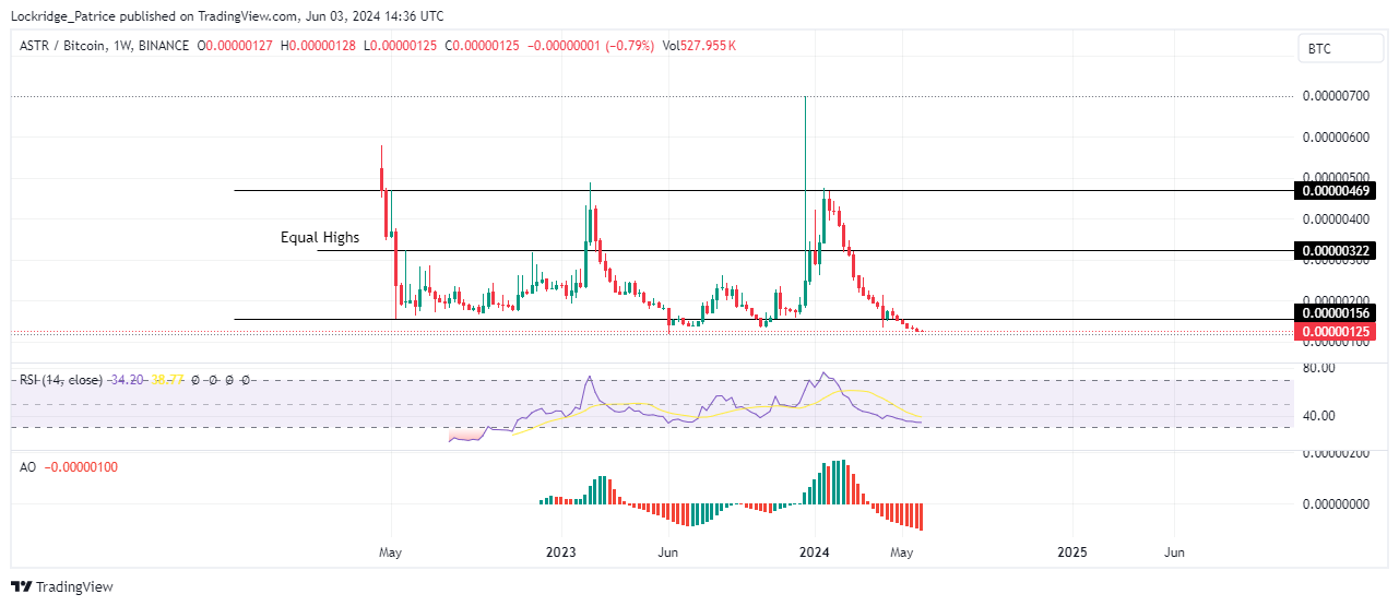 Astar alcanzó un máximo histórico de 0.00000700 BTC en diciembre, superando los máximos de 2022 de 0.00000322 BTC. Sin embargo, la ruptura resultó prematura, ya que el precio de Astar corrigió poco después.