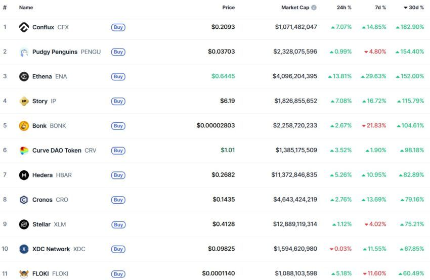 Entre las criptomonedas con mayor crecimiento en julio, destacan cinco que superaron el 100% de ganancias. Conflux (CFX) lideró con un crecimiento cercano al 183%, seguido de Pudgy Penguins (PENGU) y Ethena (ENA), que también registraron rallies superiores al 150%. Story (IP) y Bonk (BONK) completan el top, con cifras que superaron el 104%.