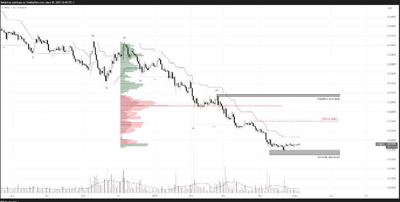 Técnicamente, el par ETHBTC muestra una prolongada tendencia bajista, marcada por máximos y mínimos descendentes. El precio actualmente se encuentra operando cerca de una zona de demanda clave en torno a los 0.018 y los 0.020 BTC, donde previamente ha reaccionado al alza.