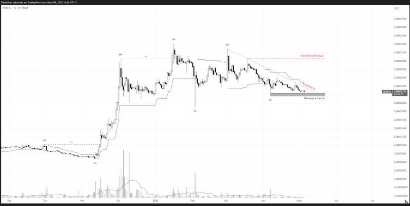 Aunque aún no hay una ruptura clara de estructura, el volumen reciente comienza a mostrar signos de interés comprador. En el caso de un rebote, la zona de los 0.030 BTC aparece como el principal objetivo de mediano plazo, alineado con el punto de control del volumen.
