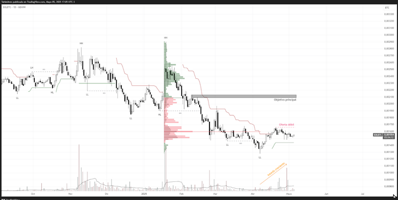 En el par SOLBTC, el gráfico muestra un intento de cambio estructural luego de una larga fase bajista. Aunque los máximos y mínimos siguen siendo descendentes, se observa interés creciente en volumen y una consolidación por encima del soporte clave de 0.0014 BTC.