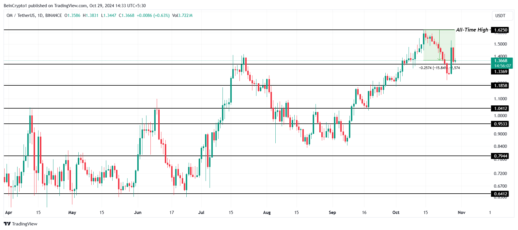 OM se ha convertido en uno de los tokens cripto más buscados gracias a su impresionante tendencia alcista durante octubre. La altcoin recientemente alcanzó un nuevo máximo histórico (ATH) de 1.62 dólares, atrayendo una atención significativa de los inversores. Este hito ha posicionado a OM como un activo destacado en el mercado.