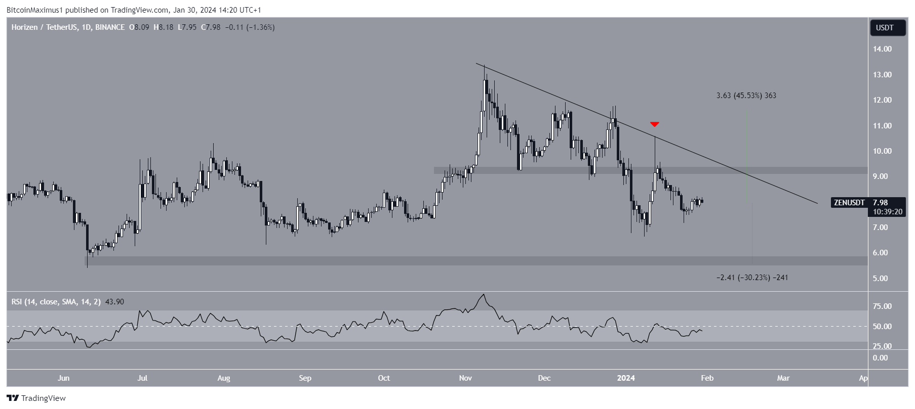 SponsoredA pesar de este anuncio positivo, la acción del precio de ZEN no es alcista todavía. El marco de tiempo diario muestra que el precio ha caído bajo una línea de tendencia de resistencia descendente desde el 8 de noviembre de 2023.