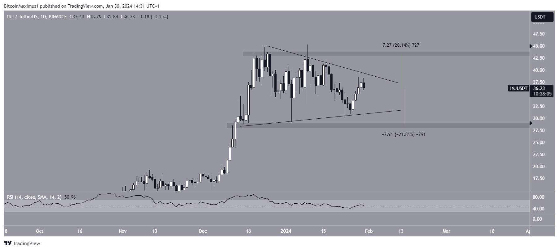 El precio del INJ se ha negociado dentro de un triángulo simétrico a largo plazo desde el 24 de diciembre de 2023. El triángulo simétrico se considera un patrón neutral, que puede dar lugar tanto a rupturas como a caídas.