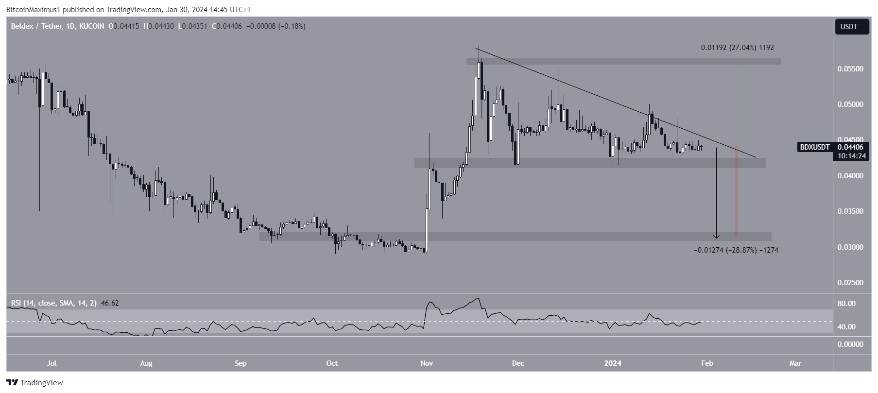 A pesar de esta predicción bajista del precio del BDX, una ruptura de la línea de tendencia de resistencia puede desencadenar un aumento del 28% hasta la resistencia más cercana en 0.056 dólares.