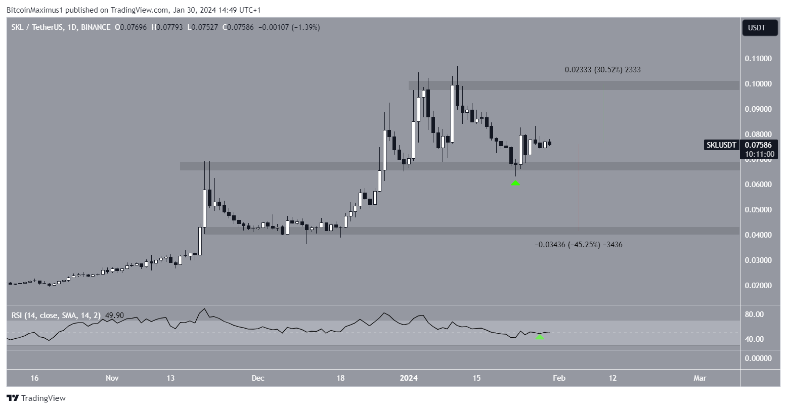 El precio de SKL rebotó el 23 de enero, validando la zona horizontal de 0.068 dólares como soporte. El rebote fue seguido por un aumento del RSI por encima de 50 poco después.