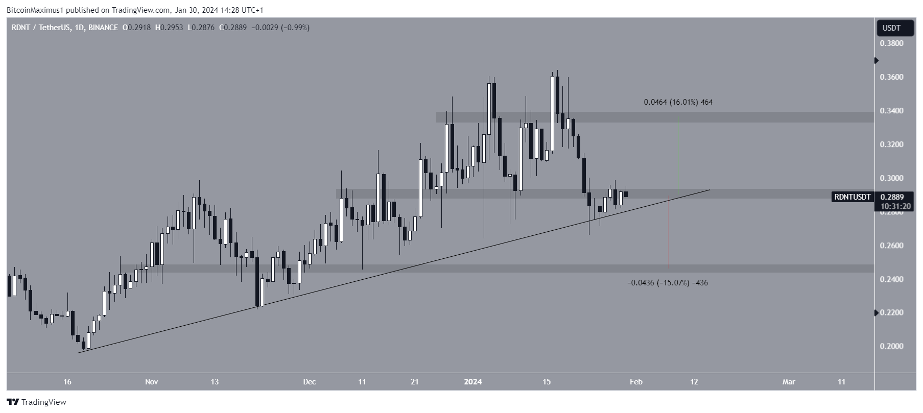 El precio de RDNT ha aumentado junto a una línea de tendencia de soporte ascendente desde octubre de 2023. Más recientemente, rebotó en la línea de tendencia en enero de 2024 (icono verde). Sin embargo, el rebote se ha debilitado, y RDNT negocia por debajo de la zona de resistencia de 0.29 dólares.