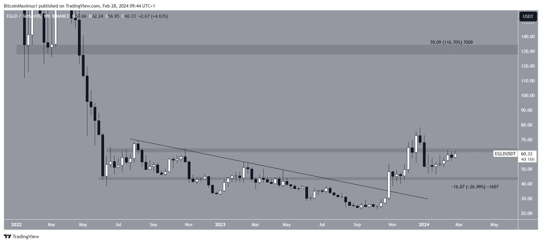 El precio de EGLD rompió una línea de tendencia de resistencia descendente y alcanzó un máximo de 78 dólares en diciembre de 2023. El precio cayó después, pero recuperó su equilibrio en febrero de 2024.