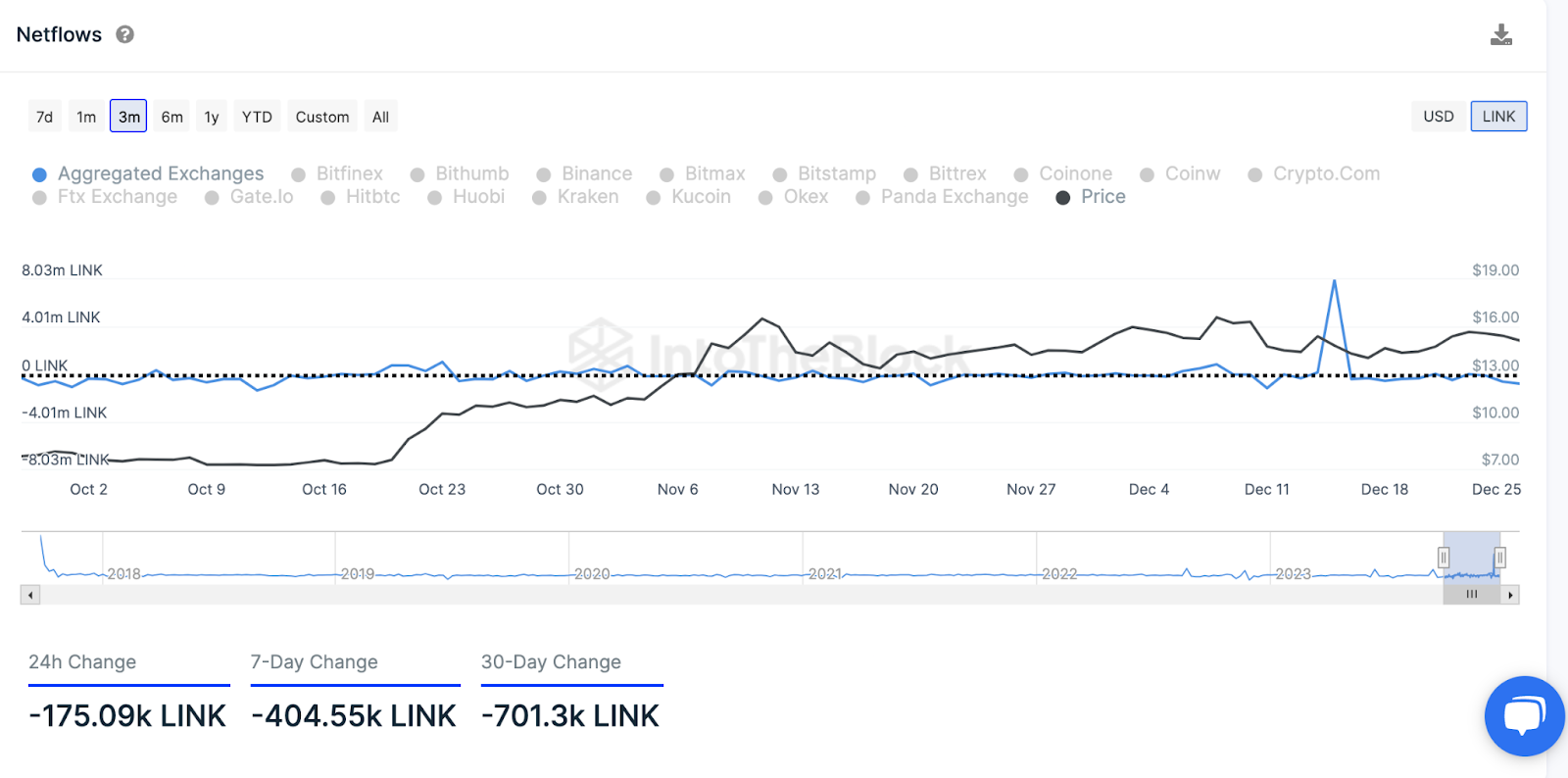 SponsoredPor último, la captura de pantalla a continuación confirma que ha habido una acumulación significativa de ballenas de Chainlink. En las últimas 24 horas, el saldo de LINK de los exchanges centralizados disminuyó en 175,090 tokens. Mientras tanto, en los últimos siete días, el saldo se ha reducido en al menos 400,000 tokens LINK.