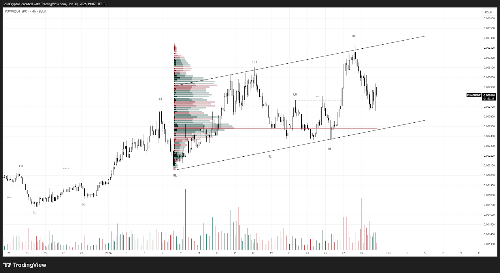 El riesgo bajista se activa si el precio pierde el soporte inferior del canal y el POC de volumen cercano a 0.0025 USDT. Ese quiebre podría provocar una aceleración bajista hacia zonas de mayor liquidez, invalidando temporalmente la estructura de continuación alcista.
