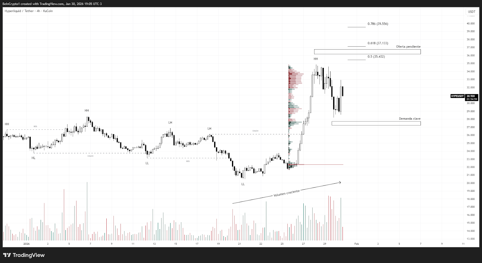 En un escenario alcista, mientras el precio se mantenga por encima de la demanda ubicada en torno a los 27-28 USDT, HYPE podría buscar la zona de oferta pendiente entre 35-37 USDT. La confluencia con niveles de Fibonacci refuerza la probabilidad de una extensión alcista si el mercado general acompaña.