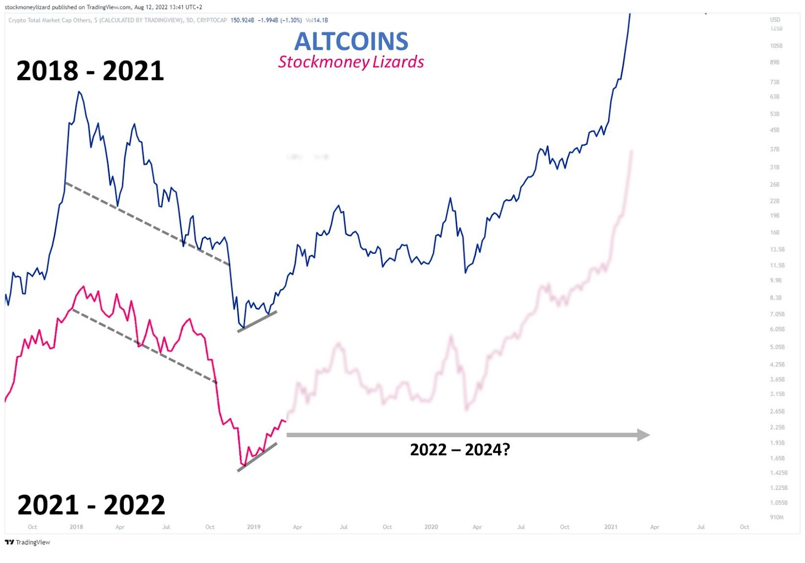 El analista del mercado de criptomonedas @StockmoneyL tuiteó un gráfico de 5 días de TOTAL2. Compara los fractales del mercado actual de las altcoins y el período 2018-2021 entre sí.